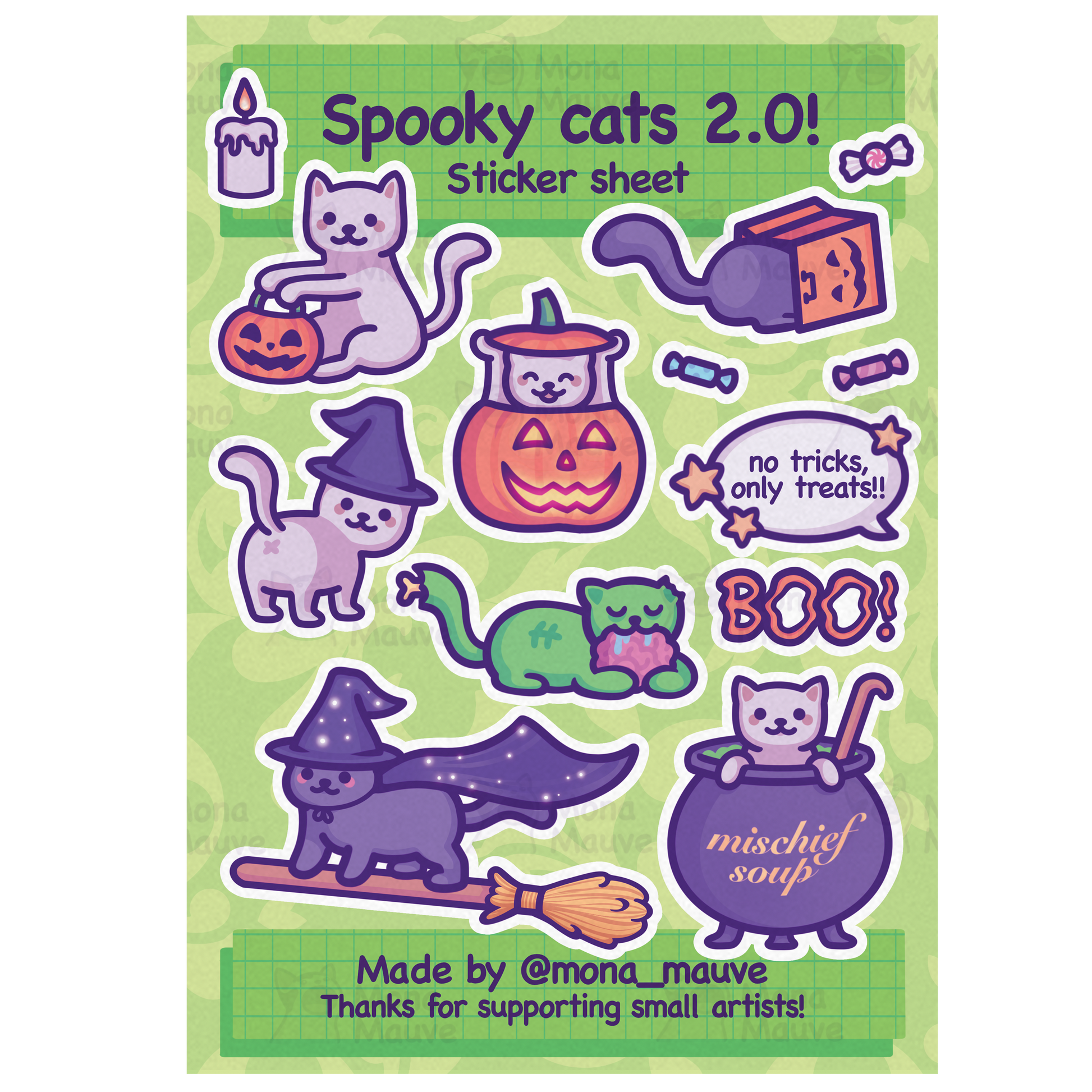 A cute Halloween sticker sheet for the spooky season! 👻 The sticker set contains 7 spooky cats and 6 other small Halloween-themed stickers.