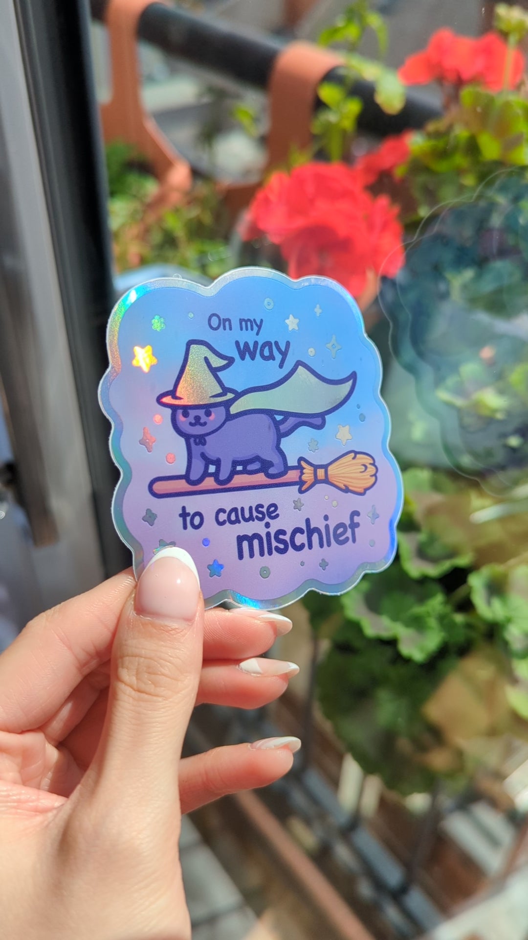 On My Way to Cause Mischief! | Cute Holographic Vinyl Cat Sticker