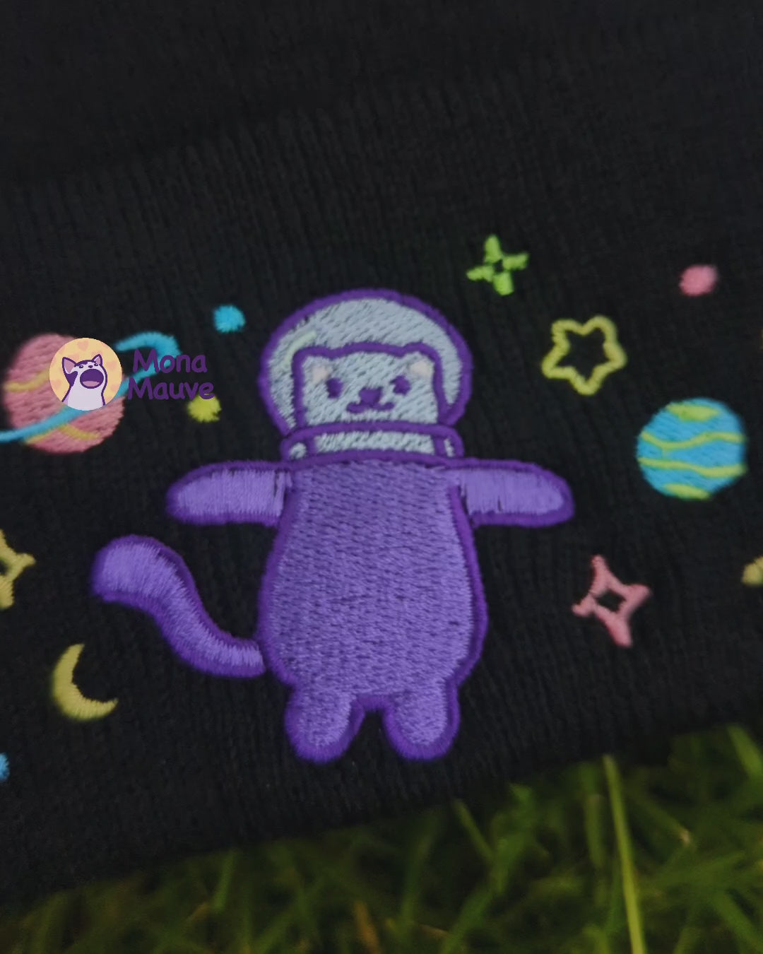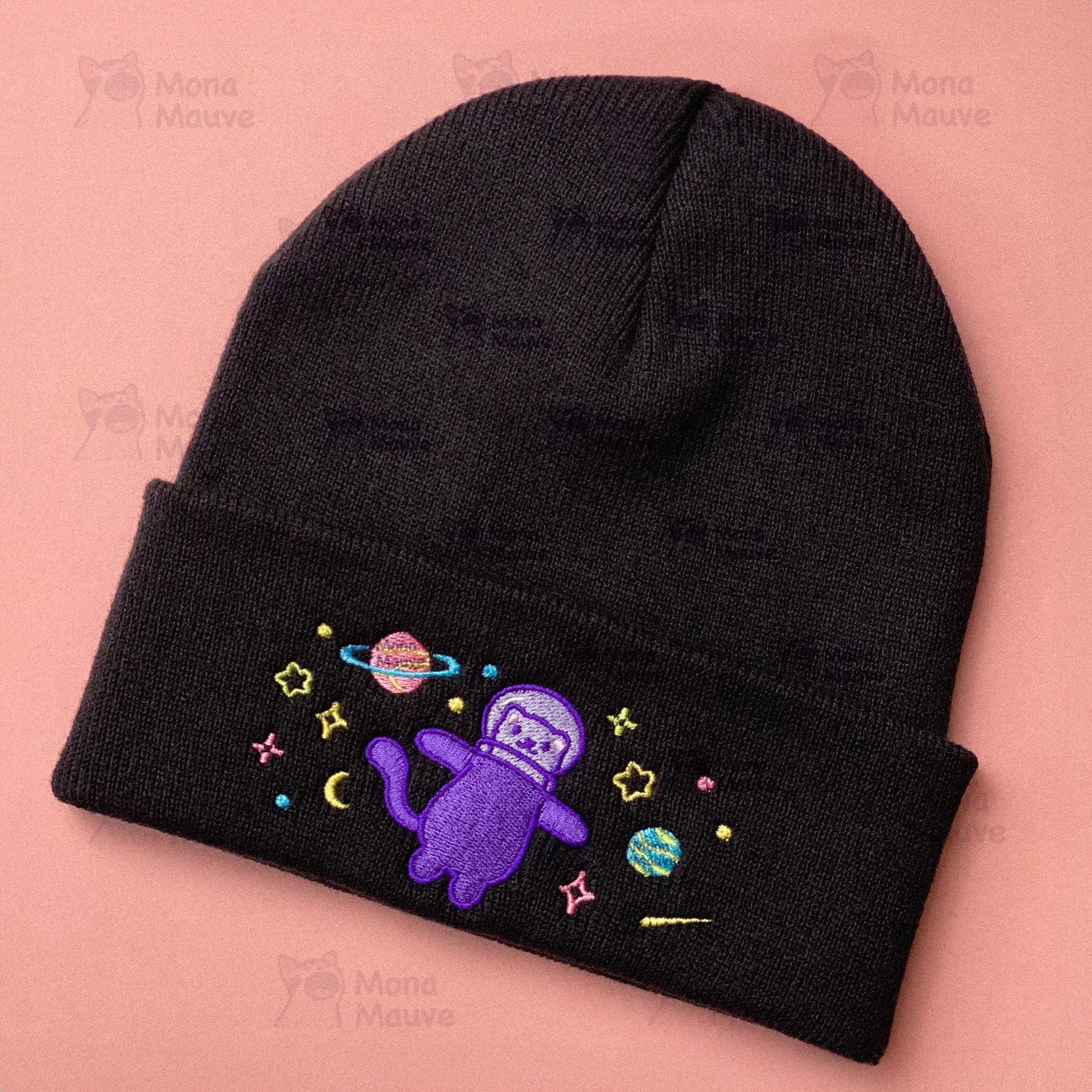 Cute Space Cat Embroidered Beanie | Black Knit Winter Hat