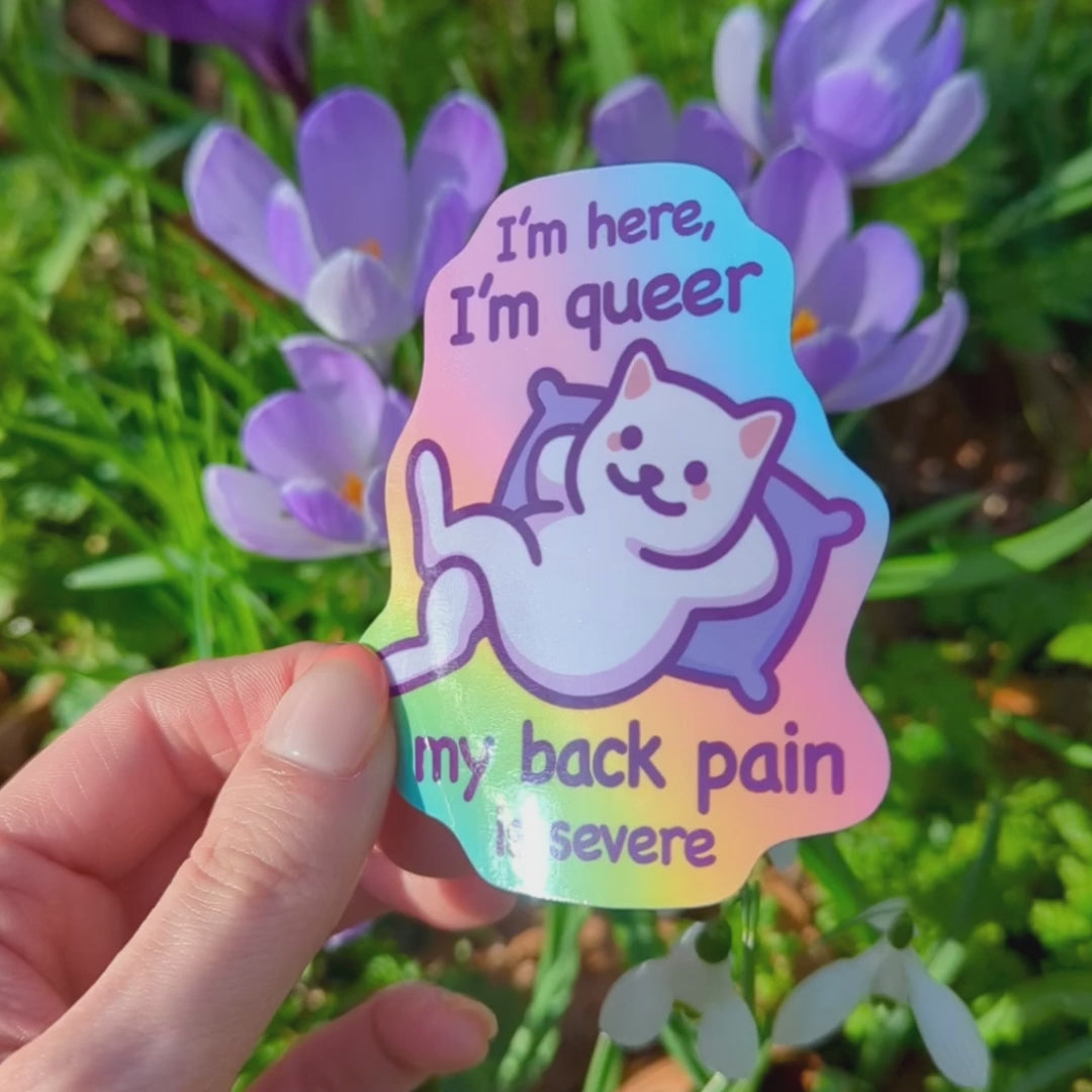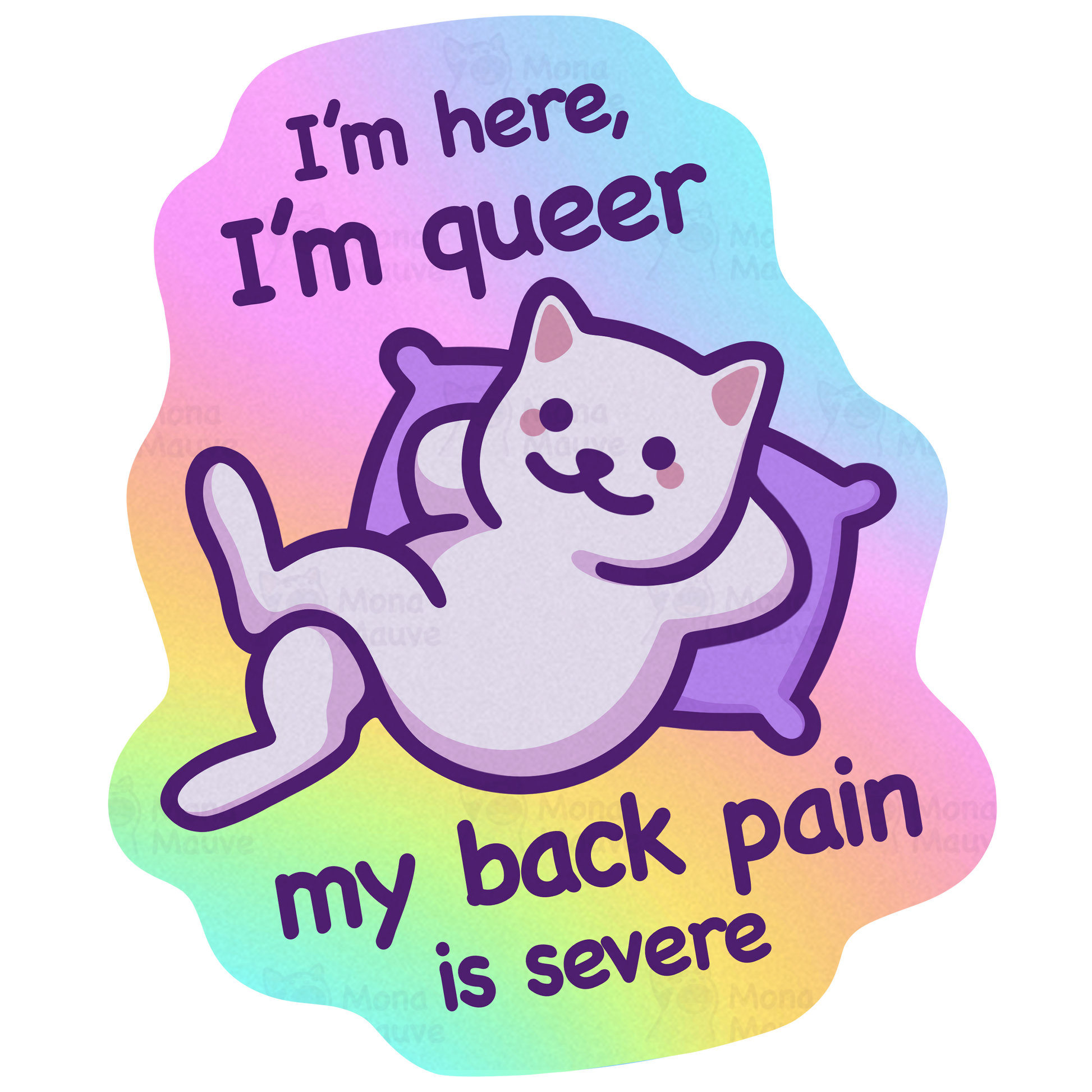 "I'm here, I'm queer, my back pain is severe" vinyl sticker - a cat meme waterproof sticker great for decorating your water bottle, laptop, notebooks, or anything else that needs a bit more ✨pizzazz!✨