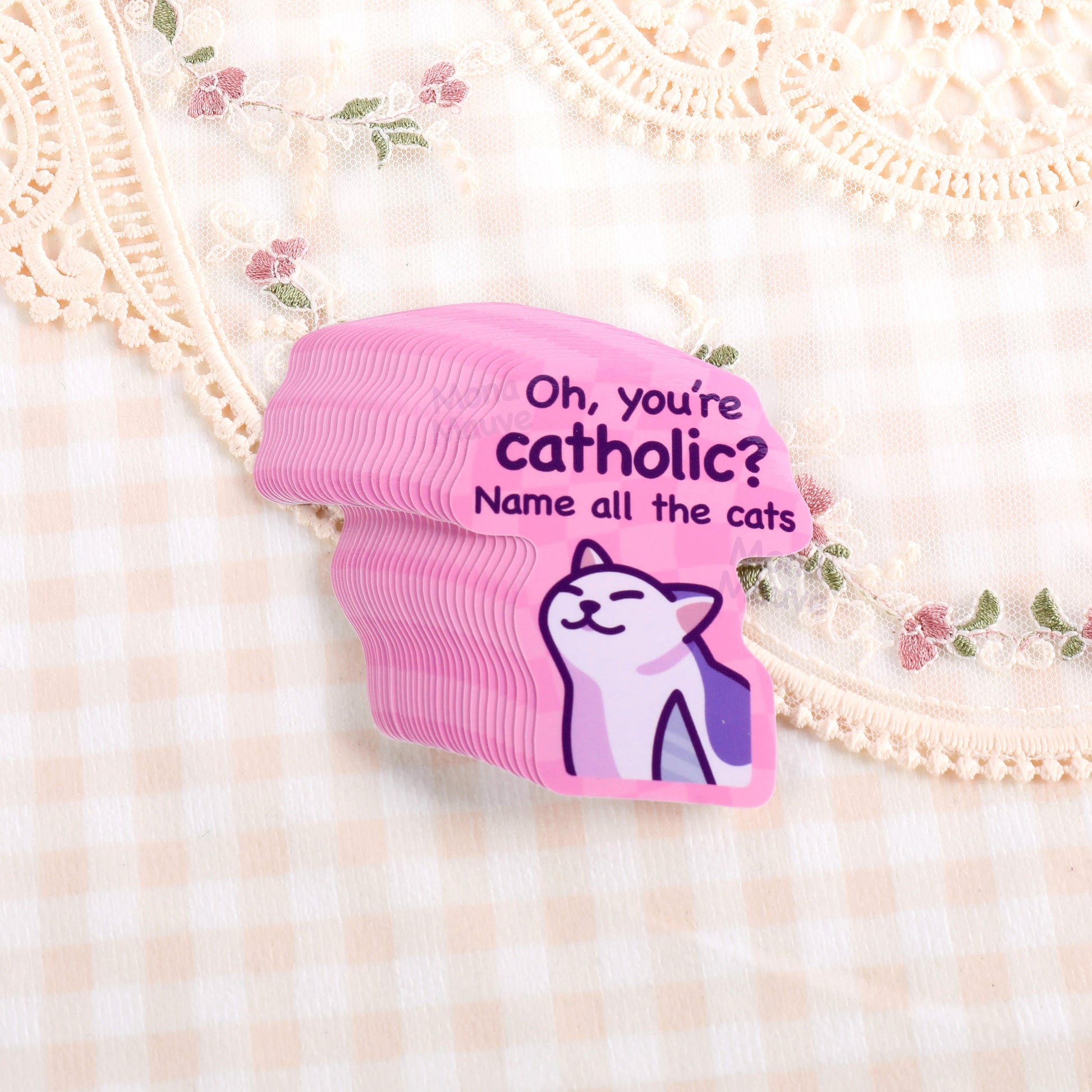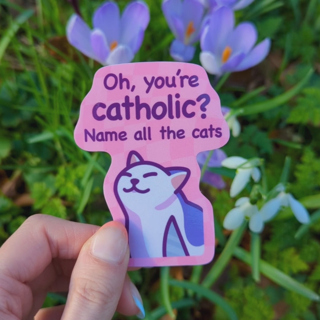 "Oh, you're catholic? Name all the cats" vinyl sticker - a cat meme waterproof sticker great for decorating your water bottle, laptop, notebooks, or anything else that needs a bit more ✨pizzazz!✨