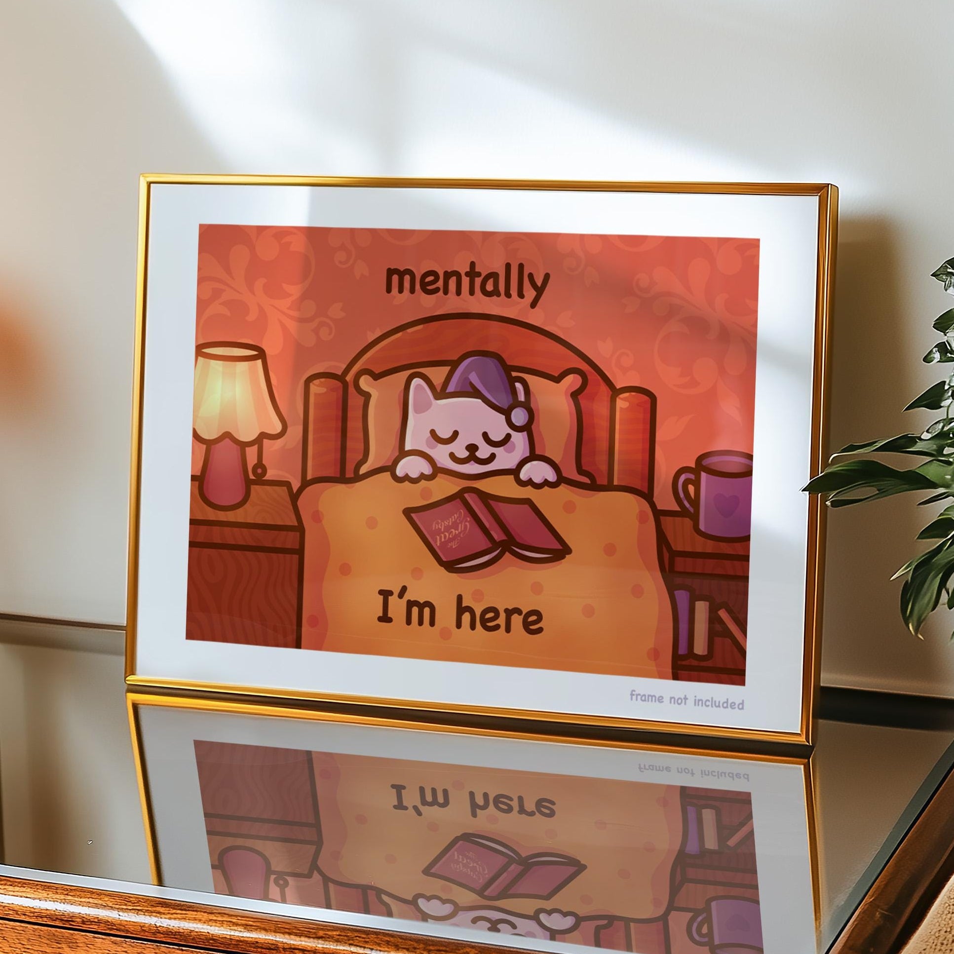 A cosy art print of a kitty snoozing and enjoying life, with the text "mentally I'm here" 😺