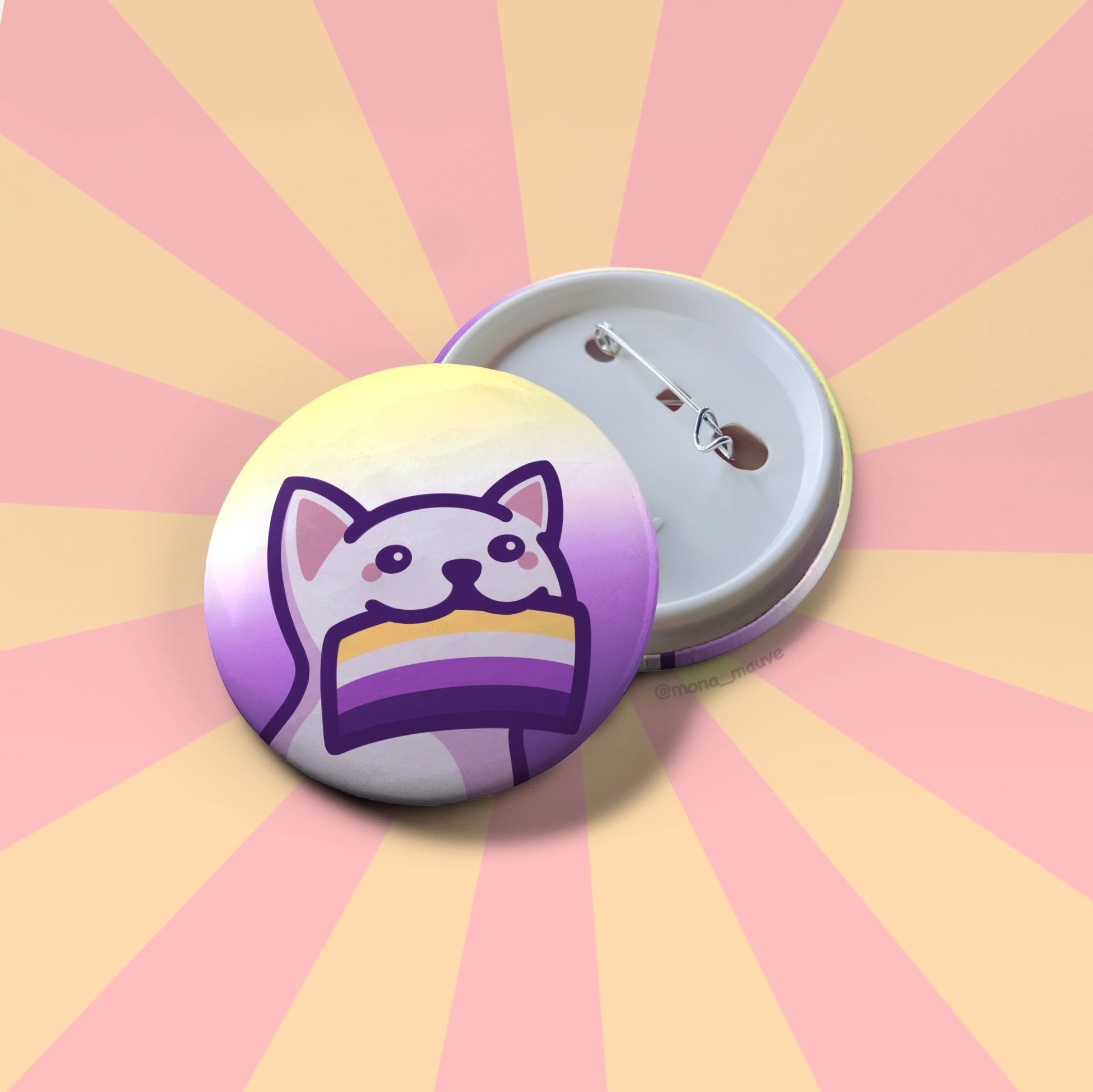 An adorable LGBTQ+ pride button badge of a cat holding a non-binary pride flag! 😸🏳️🌈 Wear this badge as a declaration of support for diversity, or gift it to your queer loved one as a congrats on coming out/during pride month to help them embrace their individuality! 🐱💞