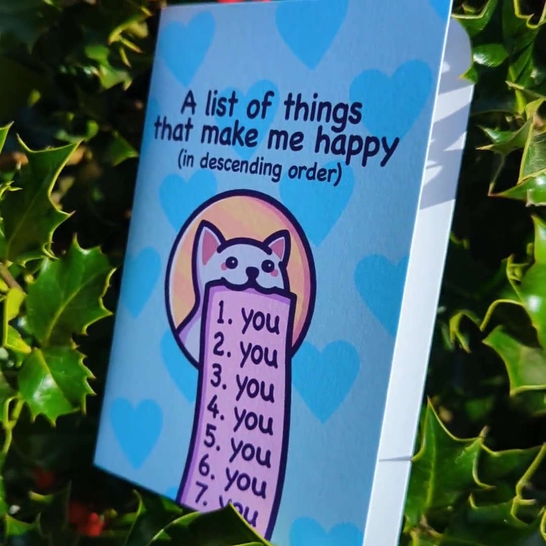 A list of things that make me happy - nothing like a cheesy cat meme card for an anniversary or other special occasion! A heartfelt reminder to your special person that they are very loved.
